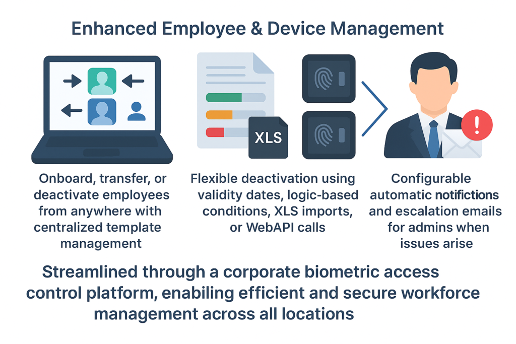 Streamlined through a corporate biometric access control platform, enabling efficient and secure workforce management across all locations.