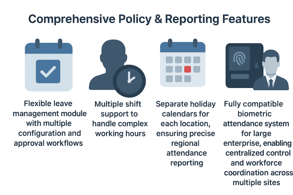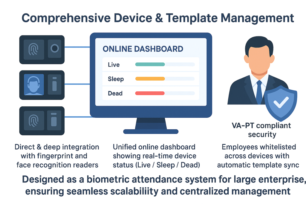 Fully compatible biometric attendance system for large enterprise, enabling centralized control and workforce coordination across multiple sites.